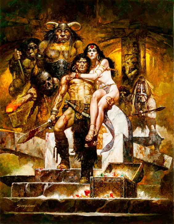 the original art, it just looks like a mohawk, this picture is from right near the end of the story, funny things going on in the background, a little post-medieval, the Khazaki – Kozakis – Cossacks, in the analogue that is Poul Anderson’s brain, Japanese, Scandanavian guy, lucky, plot magic, a lot of females, Ching Chun Chen aka Ensign Kim, taught astrogation from her grandfather, our Conan figure, prematurely old looking, a forehead scar, had many women attracted to him (including the native women), L. Sprague de Camp, rishathra, cultural vs. wenching,
