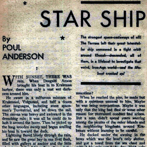 Planet Stories, Fall 1950, the description therein, The strangest space castaways of all!, weirdly medieval, the life-boat cracked up, an AI that rebelled against them, this episode of Star Trek Voyager, all simulation, Paul unleashed, “The Paradise Syndrome”, not good depictions of Native Americans, C.J. Cherryh’s the Foreigner series, 12 novels vs. 90 minutes, padded vs. lean and mean, the backstory is all in here, a two part Voyager episode, Star Trek The Next Generation, an episode of The Orville, time works differently down there, Interstellar (2014), “Blink Of An Eye”, Dragon’s Egg by Robert L. Forward, “Mad Idolatry”, Sandkings by George R.R. Martin, Ted Sturgeon’s Microcosmic God, accelerated rate vs. accelerated time, all they needed was a remote control, Aliens (1986), the orbiting Sulaco, their away mission included the entire crew, Apollo 11, you gotta leave Michael Collins up there, subspace vortex, your people with your equipment, one in a billion chance, one ion storm, wrong timeline?, what Heinlein did, Poul Anderson’s complete psychotechnic league, the third story, Flandry, egalitarian, looser, Sandra Miesel, Startling Stories, Winter 1955, back in the early 1940s Robert A. Heinlein let it be known, The Snows Of Ganymede, a bare outline, fantasy and prophecy, the first 250 years, 2875, The Star Ways, some of them are as yet unwritten, Cold Victory wasn’t published until the 1980s, Oswald Spengler, The Decline of the West, Arnold J. Toynbee, anthropoid robot invented, anti-robot riots, a historical view, a me discovering this, psychodynamics was created, the early death of Dwight D. Eisenhower. U.S. Socialism in the 1950s, like Asimov’s psychohistory, influence government policy and popular attitudes, his own Foundation, uncomfortable questions, realism vs. idealism, Anderson’s political beliefs, he reversed his strong support for the United Nations, more cynical, cycles of history, libertarian?, internationalist, individualist, any other stories, a reversal of The High Crusade, capes, cannons, siege engines, medieval futuristic, Jack Vance, only three generations, a mix of elements, The Dragon Masters, worldbuilding happened outside of the plot, like reading Heinlein, he has a plan, Friday is set in the same universe as Farmer In The Sky, part of a greater universe, reading his openings more than once, nobody with amnesia,